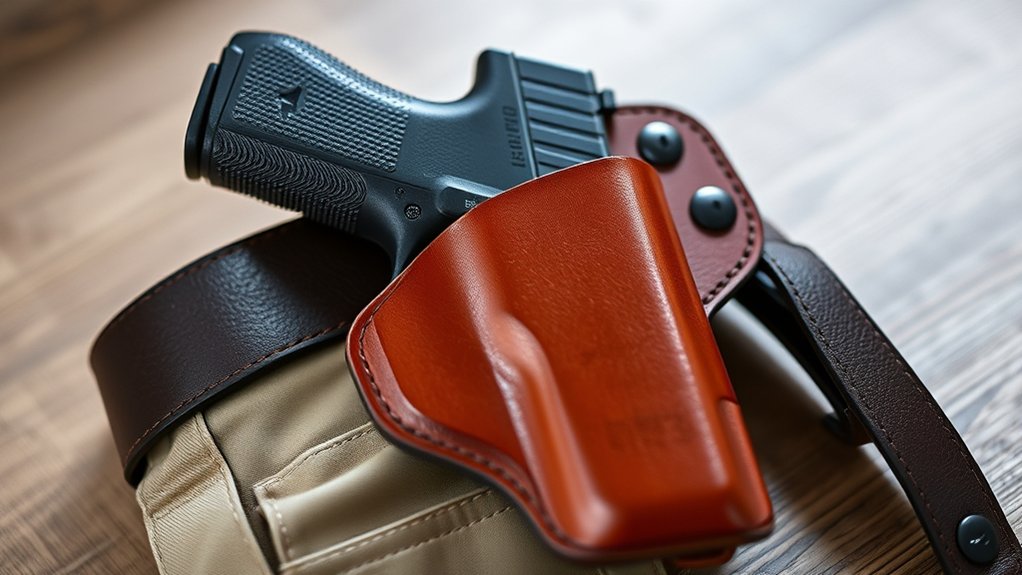 For leather holsters, apply a leather conditioner occasionally to keep it supple. Regularly check for any damage or wear. Proper maintenance guarantees your holster stays reliable and comfortable every time you carry.