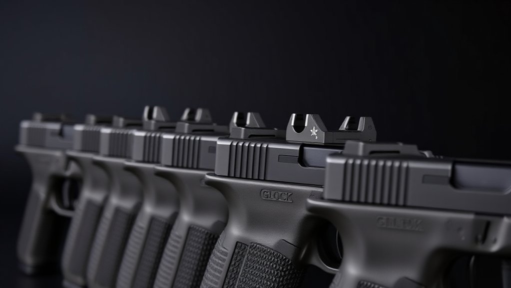 Although adjustable sights offer great customization, guaranteeing compatibility with your specific Glock model is essential. Different sights fit certain generations or slide types, so you need to double-check this before buying. Also, confirm the mounting system, whether Weaver, Picatinny, or dovetail, matches your firearm’s rail or slide configuration.