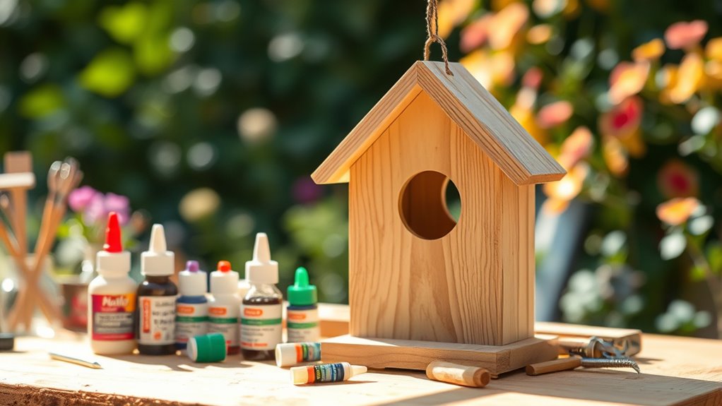 You want glue that’s waterproof, durable, and bonds well to wood, metal, and plastic for your birdhouse projects. Look for adhesives with strong tensile strength (500+ psi) and weather resistance to withstand outdoor conditions. Clear drying, non-toxic formulas like silicone gels or multi-purpose adhesives such as E6000 work great.