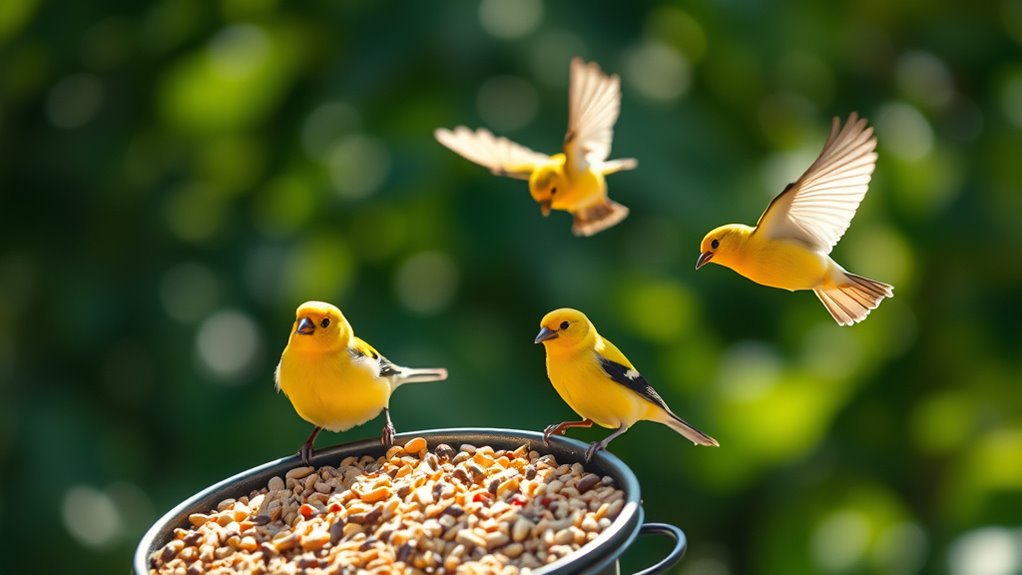 You’ll notice their bright yellow flashes as they perch and feed, then dart to nearby branches. Avoid large, open platforms that spill seed and invite other birds. Clean weekly to prevent mold, and rotate feeders for consistent visits.