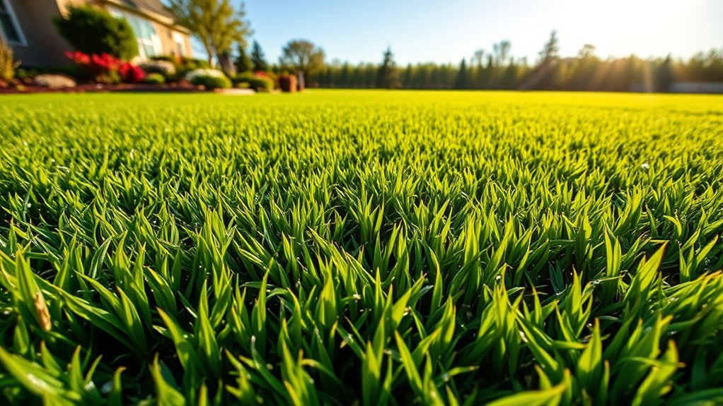 Enhanced seeds with fertilizers or special coatings can also promote faster germination and thicker, healthier lawns in less time. For best results, plant during spring or fall, when conditions support quick establishment and strong growth. This approach guarantees you get a vibrant, durable lawn efficiently.