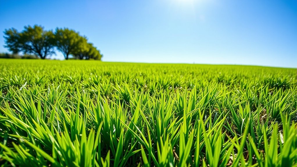 Because Central Texas faces hot summers and intense sunlight, you need grass seed that thrives in heat and tolerates drought. Look for varieties that handle temperatures above 80°F without going dormant, guaranteeing your lawn stays green through the toughest months.