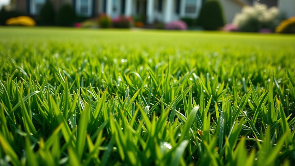 Moreover, selecting grass that germinates within 8 to 28 days helps your lawn establish quickly, allowing it to recover and flourish amid Kentucky’s seasonal shifts. Prioritizing climate adaptability guarantees your lawn remains vibrant and resilient year-round.