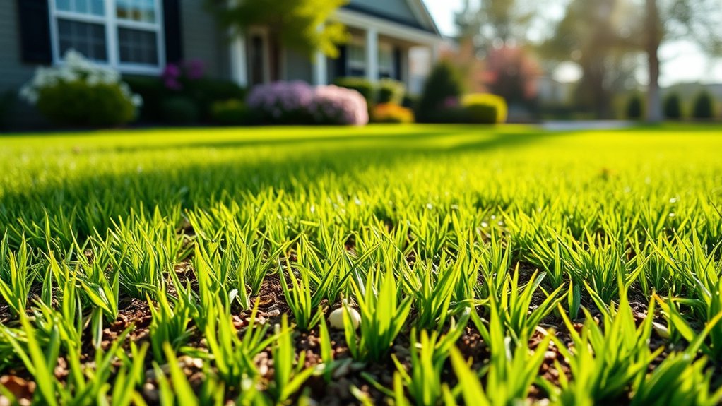 Early morning watering works best to minimize evaporation. Adjust based on rainfall and temperature to guarantee your new lawn thrives without overwatering or drying out.