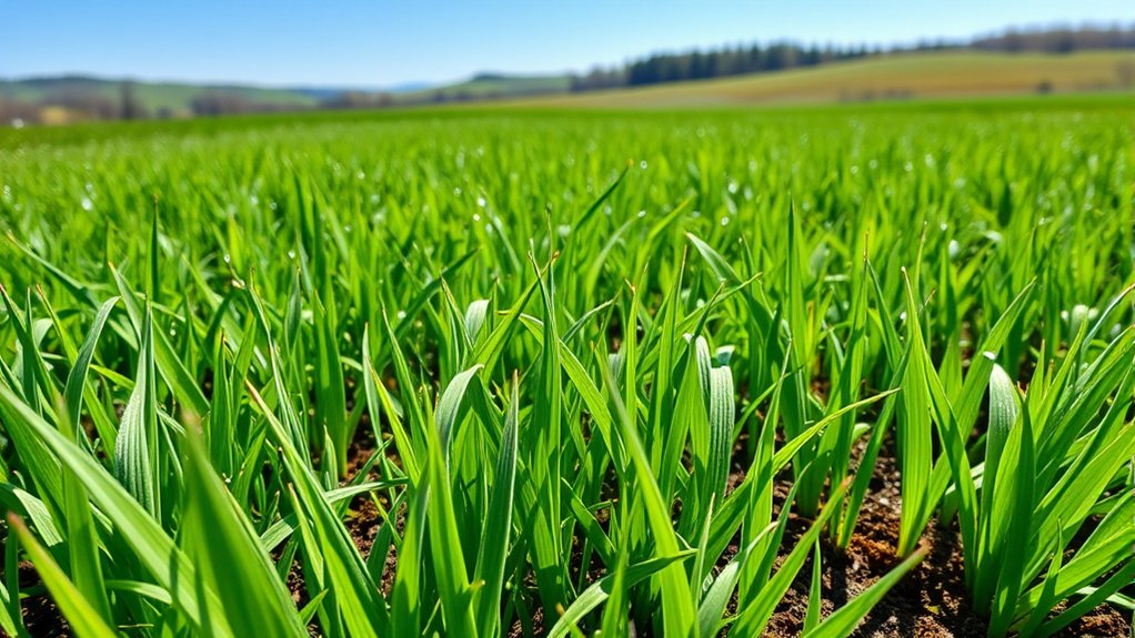 Incorporate balanced fertilizer to provide essential nutrients, and guarantee proper pH levels. These amendments create a fertile environment, helping your grass grow strong and healthy from the very beginning.