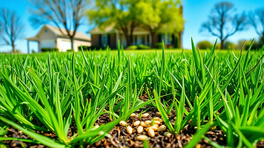 Drought-resistant seeds grow slower at first but develop deeper roots, offering long-term benefits. To maximize growth, guarantee you water regularly and provide proper care during germination to help your lawn thrive within the expected timeframe.