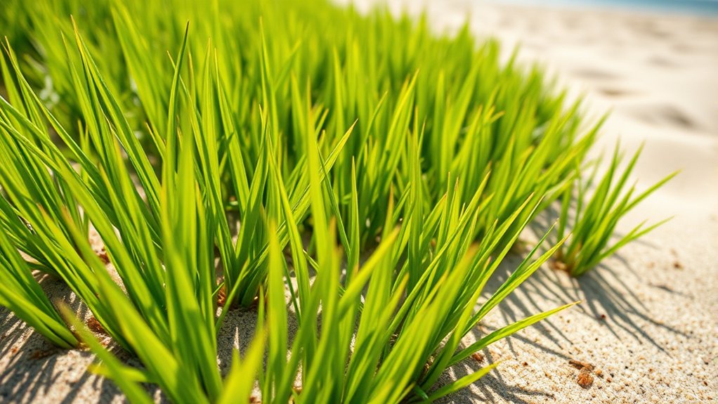 Prioritize grass mixes designed specifically for sandy conditions to guarantee your lawn stays green and strong despite the challenges. By focusing on soil compatibility, you’ll set your grass up for success in this well-draining but nutrient-poor environment.