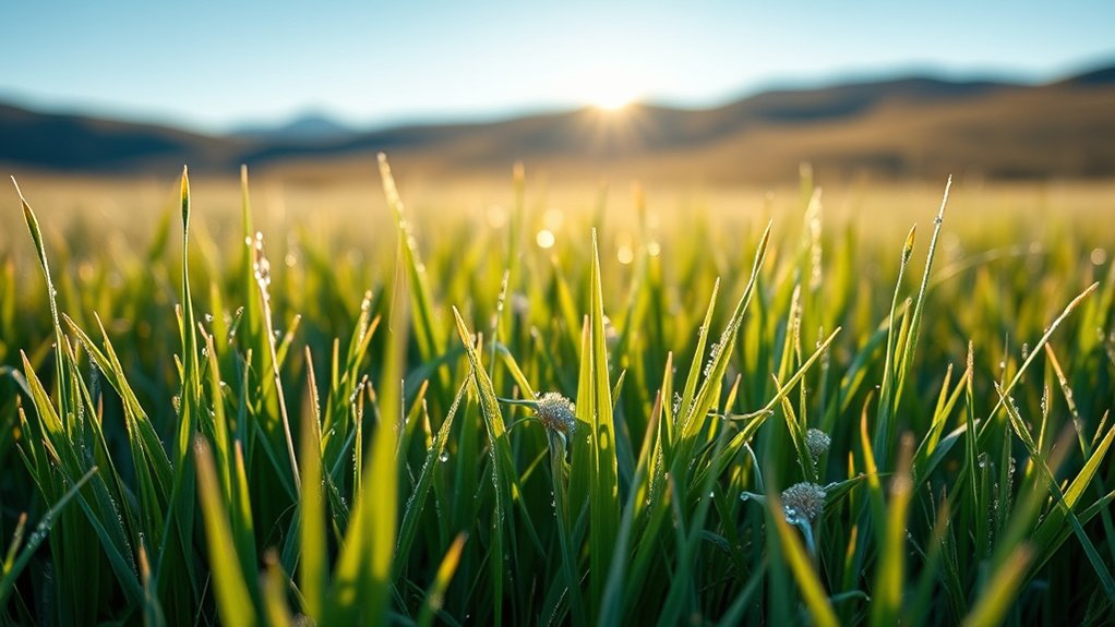 This keeps the soil consistently moist without causing runoff or disease. Adjust based on rainfall and soil moisture. Consistent, gentle watering guarantees your grass seeds develop strong roots, leading to a lush, healthy lawn despite Wyoming’s challenging weather.