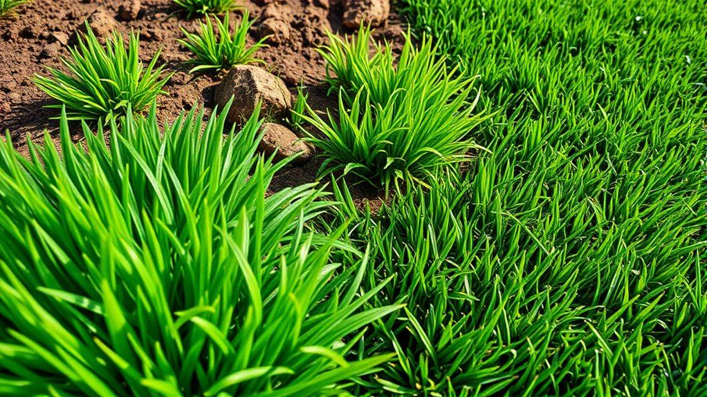These grasses usually have deeper root systems that access moisture from deeper soil layers during dry spells. Choosing blends with native or adapted species boosts drought resistance because they’re naturally suited to your climate. The best drought-tolerant grasses can endure long dry periods with less than half the water needed for traditional types.