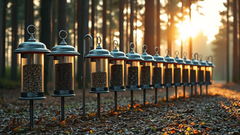 Consider feeders with clear or gauge windows to monitor levels without opening the entire unit. Select designs with minimal moving parts and no electronics to reduce maintenance needs and potential failures. Guarantee the feeder’s design provides straightforward access in various weather conditions, so upkeep remains practical regardless of rain, snow, or wind.