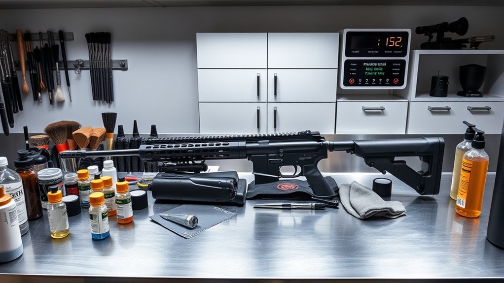 Many also include safety locks on compartments and easy-to-access emergency shutoffs. These features guarantee you can clean your guns safely, minimizing risks while maintaining your firearm’s condition effectively.
