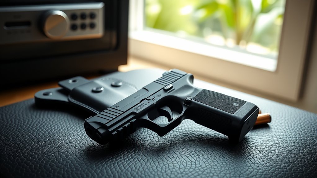 Proper holster design, with adjustable retention and a secure fit, is *vital* to prevent accidents and allow quick access when needed. Durable materials like reinforced nylon or neoprene help maintain these safety features over time, ensuring your firearm stays secure and ready whenever you need it.