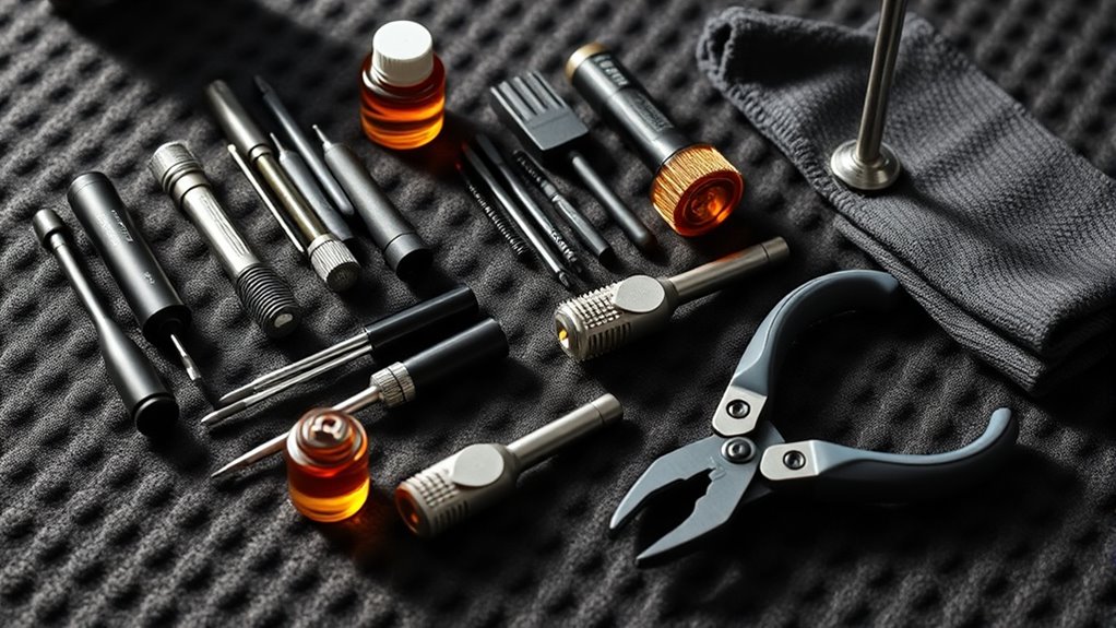 Compatibility with various calibers and models ensures the tools can adapt to different firearms, saving you time and effort. Look for tools with adjustable features like torque limiters or interchangeable bits, which expand their use and improve precision. A thorough kit combines cleaning, disassembly, and adjustment functions, reducing the need for multiple separate tools.