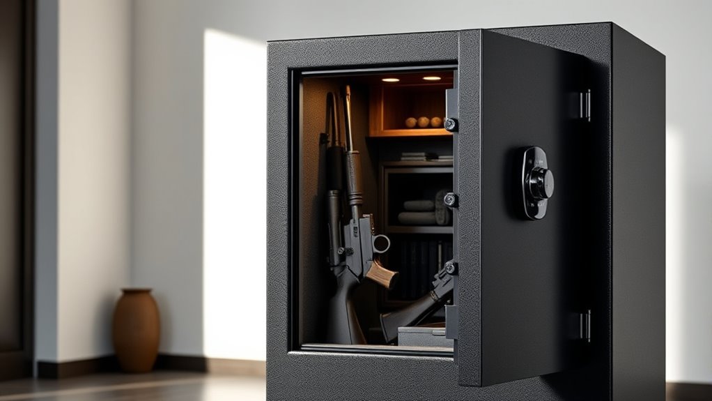 Many also offer rechargeable batteries, alarm systems, and versatile mounting options for home or travel. To find the perfect safe blending security and convenience, discover which top brands lead the way in advanced gun storage solutions.