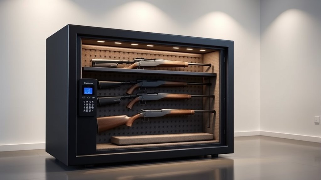 The way your firearms are organized inside can also make a difference—modular racks and adjustable shelves help you find and grab your guns swiftly. Silent access features, such as hidden disabling methods, let you enter discreetly without alerting intruders.