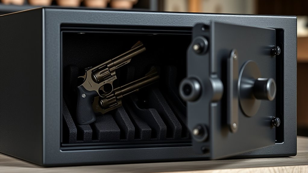 Don’t overlook internal design elements like lighting and quick-open hinges or sliding doors, which streamline reaching your revolver once the safe’s unlocked. Prioritizing these access speed features ensures you’re ready whenever you need your revolver fast.