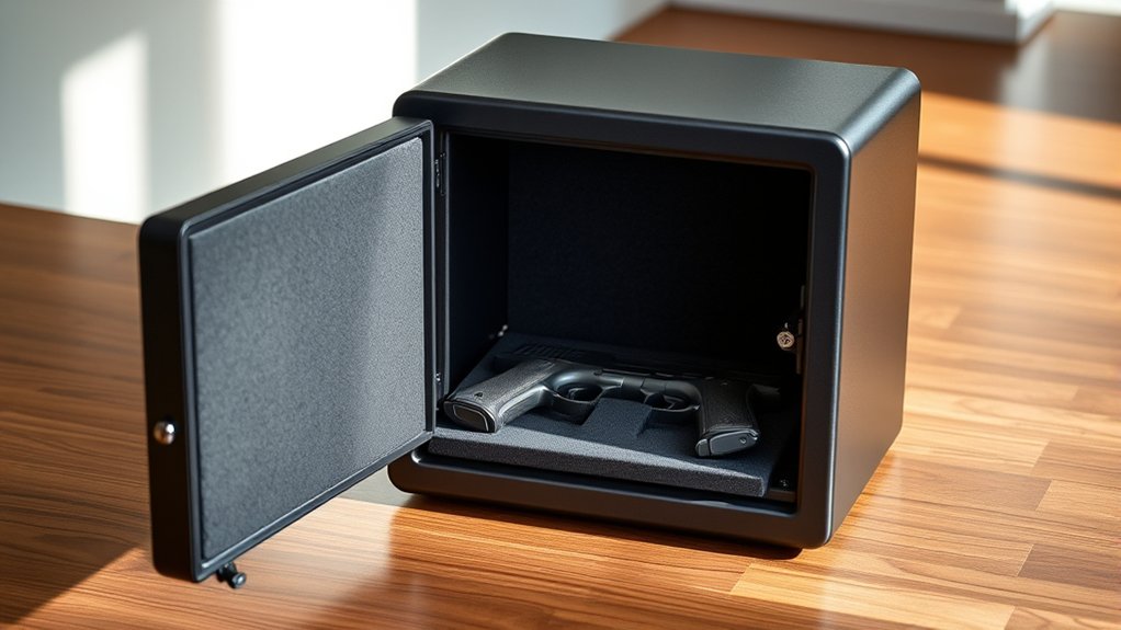 You’ll also want tamper-resistant designs to deter break-ins. Many safes include options like security cables and mounting capabilities to prevent theft. These combined features guarantee your gun safe not only keeps your handguns secure but also provides peace of mind knowing you’ve minimized risks from unauthorized users.