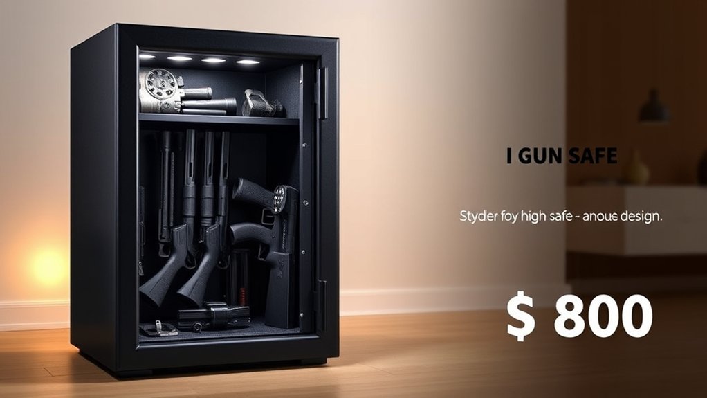 When selecting a gun safe under $800, you need to focus on security features that protect your firearms effectively. Consider the variety of accessibility options to guarantee quick retrieval when needed, while also choosing a size that fits your space.