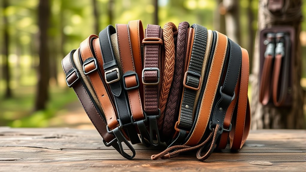 Adjustable length and quick-detach mechanisms let you customize the fit and access your firearm swiftly when needed. Silent swivels and noise-reducing materials help you stay stealthy, avoiding unnecessary sounds that could spook game. Also, consider specialized attachments like thumb loops or quick-release buckles—they enhance handling, safety, and ease of movement in dynamic outdoor situations.