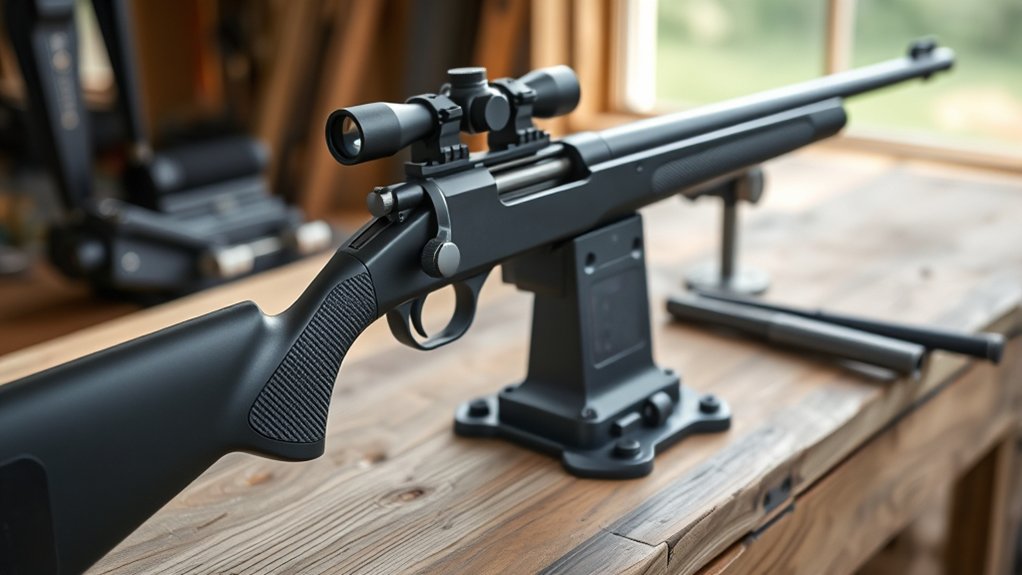You’ll want a gun vise that firmly secures your firearm for precise sighting and easy maintenance. Models like the Caldwell Steady Rest NXT and Tipton Ultra Gun Vise offer adjustable, non-marring cradles and customizable features to fit various guns.