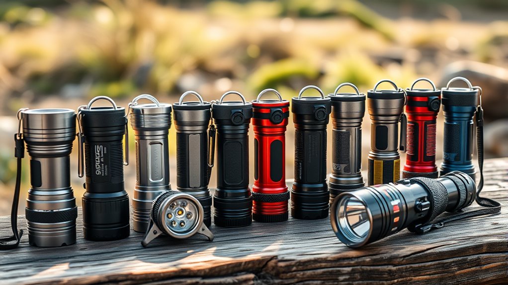 Compact dimensions like 3.94 x 2.05 x 1.02 inches allow you to stash the flashlight in pockets, bags, or glove compartments effortlessly. Some come with clip-on options or carry straps, making it simple to attach them to your backpack or belt. Prioritizing lightweight, ergonomic designs confirms you stay comfortable while using the flashlight for extended periods.