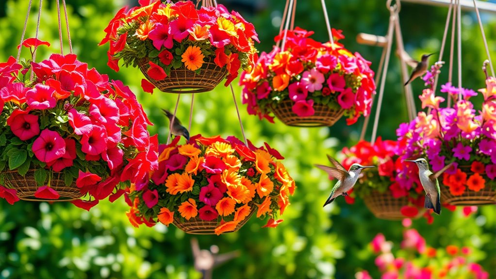 This way, you’ll create a vibrant, reliable food source that keeps hummingbirds coming back to your hanging baskets all season long.