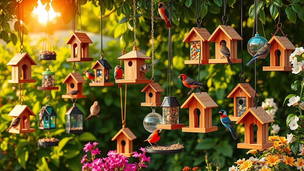 Since proper installation affects both bird safety and feeder durability, choosing the right hanging method is essential. You can install hanging bird feeders using hooks, chains, or cords, giving you flexibility to place them on trees, poles, or specially designed hooks. Look for adjustable hanging mechanisms so you can customize the height to suit different bird species and your outdoor environment.