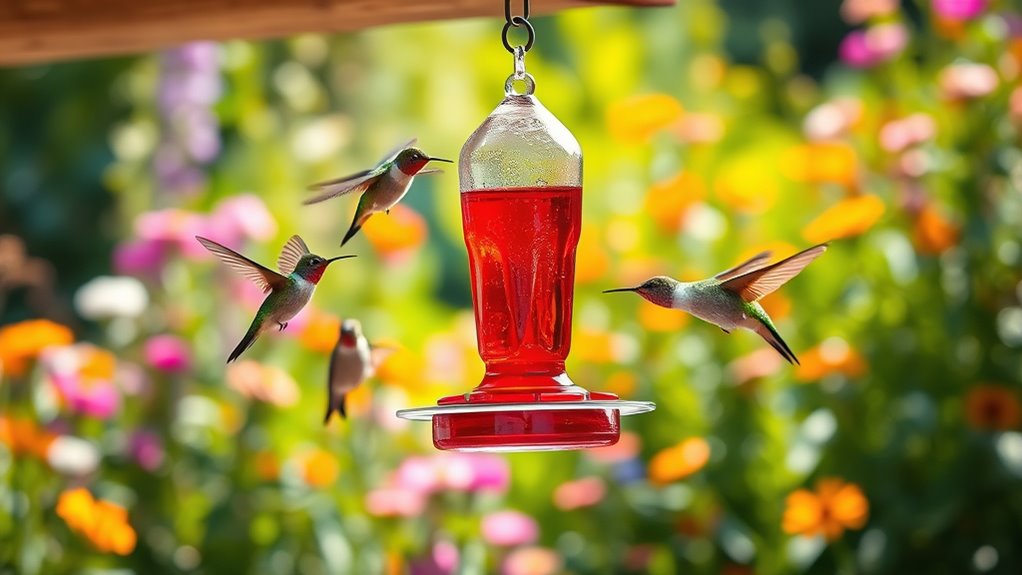 Plus, anti-insect mechanisms are usually easy to clean and refill, so maintaining pest protection won’t be a hassle. Choosing a feeder with effective insect deterrents encourages hummingbirds to visit more often, making your garden a vibrant, buzzing hotspot for these delightful birds.