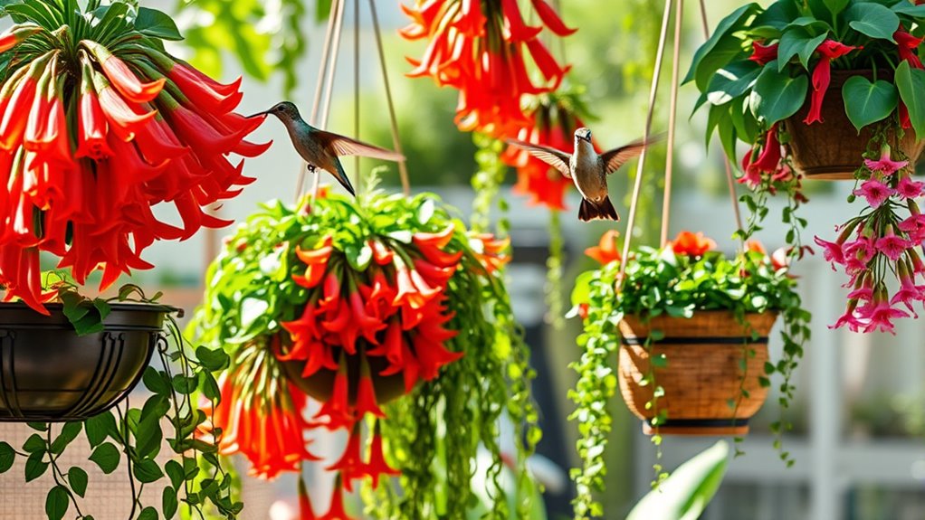Because hanging plants for hummingbirds need to thrive with minimal fuss, you should focus on species that handle drought well and require moderate to high sunlight. These plants need less frequent watering once established, making your care routine easier. Choose varieties with manageable growth rates to avoid overcrowding your hanging baskets and keep maintenance simple.