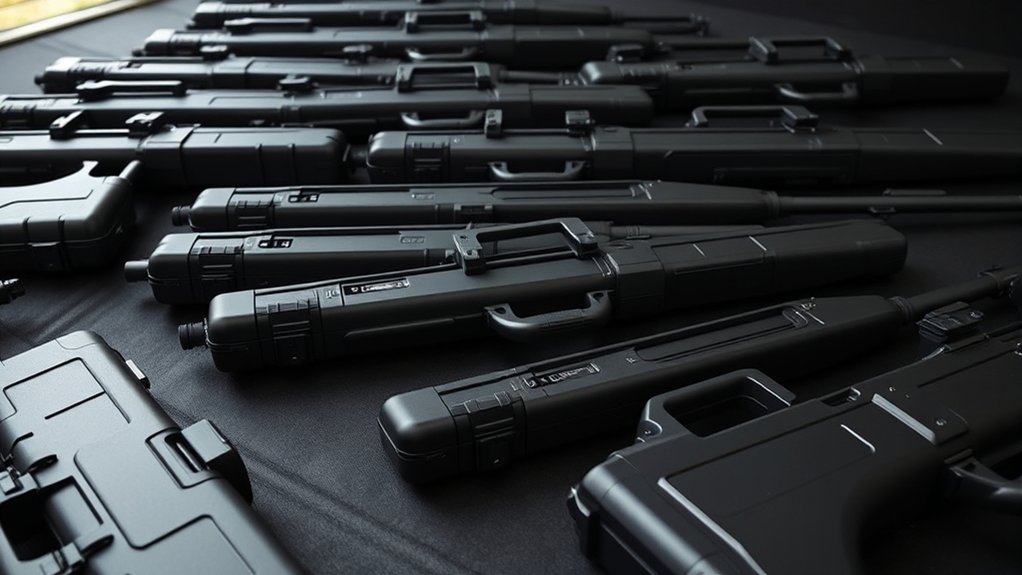 You need a hard rifle case that’s rugged and waterproof, with impact-resistant shells and customizable foam interiors to protect your firearms from shocks and moisture. Look for secure locking features like TSA-approved latches and multiple lock points to keep your guns safe during travel.