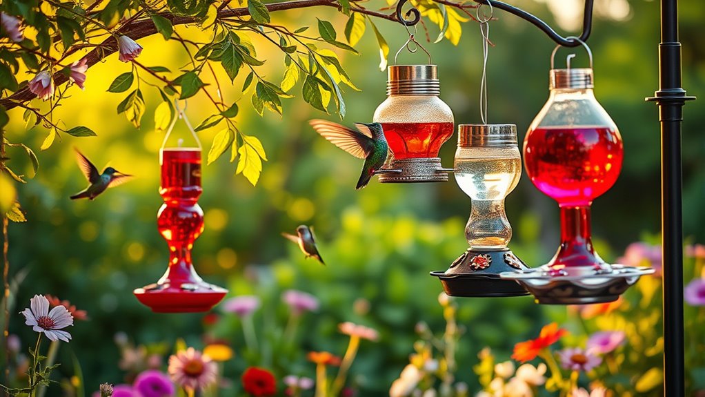 Also, consider prevailing wind directions and nearby structures to minimize disturbances and encourage more visits. Tailoring the feeder height to your environment guarantees safer, more frequent hummingbird visits.