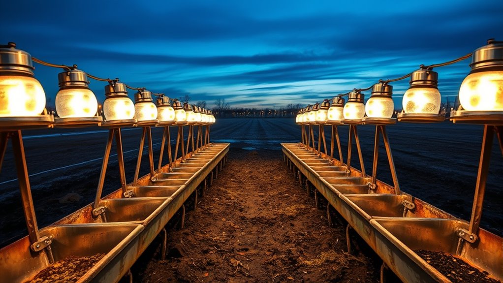 Durability and weatherproofing are nonnegotiables for hog feeder lights, especially when they’re exposed to rain, snow, or freezing temps. You should prioritize an IP66 or higher waterproof rating to withstand wet conditions and frost cycles. Choose lights made from durable materials like ABS plastic or metal that resist rust, corrosion, and harsh weather.