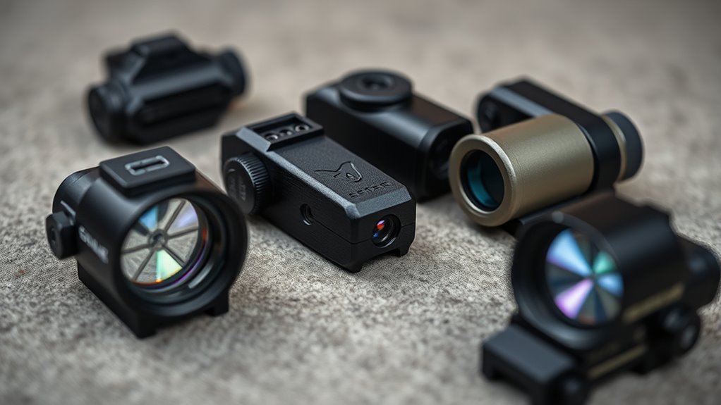 Reticle options are central to getting fast, accurate hits with a budget holographic sight. You’ll find red, green, or dual-color reticles that adapt to lighting conditions, helping you keep target acquisition quick. Some models offer multiple reticle patterns—dots, rings, or combinations—so you can tailor the sight to your shooting style.