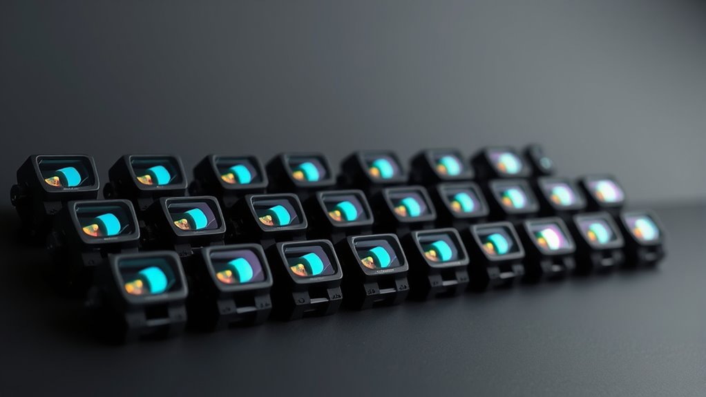 Brightness and NV capabilities matter because they directly affect how reliably you can see and aim, no matter the light. You’ll want adjustable brightness across 10–20 settings to match conditions, ensuring clear visibility from bright sun to dim indoors. Night vision compatibility matters, so look for specialized reticle options or brightness controls that work with NV devices.