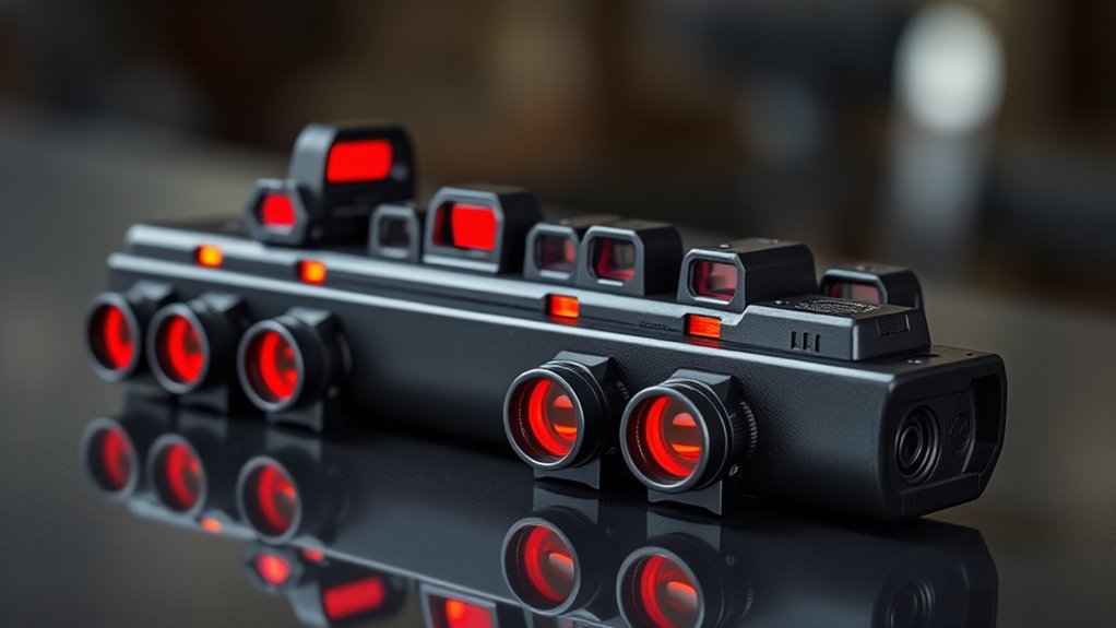 Brightness is adjustable, with up to 12 settings to keep the reticle clear in varied light. Reticle color options usually include red and green, improving visibility against specific backgrounds or lighting. Advanced systems may feature overlays or circle-dot blends to boost accuracy and rapid engagement, giving you flexible performance across dynamic shooting contexts.