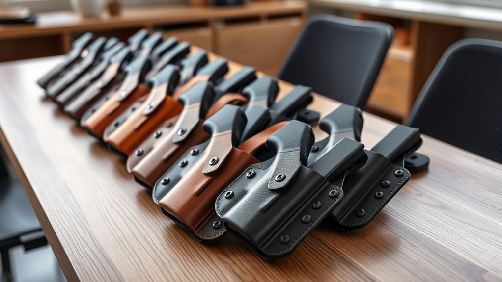 Hybrid and belly band holsters offer flexibility, while added wedges and claws help reduce printing. You’ll also find options with extra storage and easy maintenance. Keep exploring to uncover which styles suit your daily carry needs best.