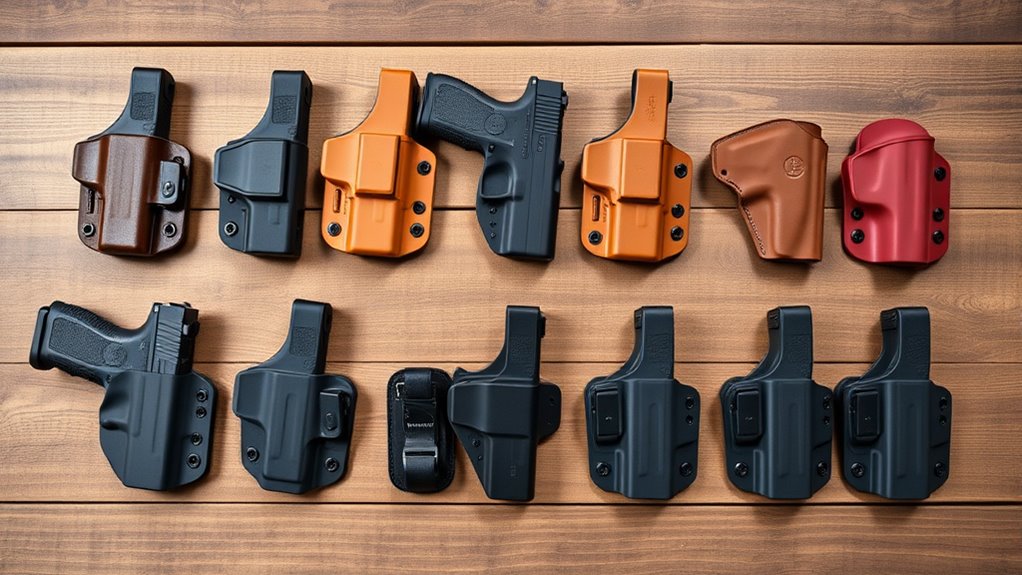Some holsters feature adjustable retention, letting you fine-tune how tightly your pistol fits, balancing security with speed. When choosing, consider how much retention you need without sacrificing quick access. Too tight, and you’ll struggle to draw; too loose, and your firearm risks falling out or accidental discharge.