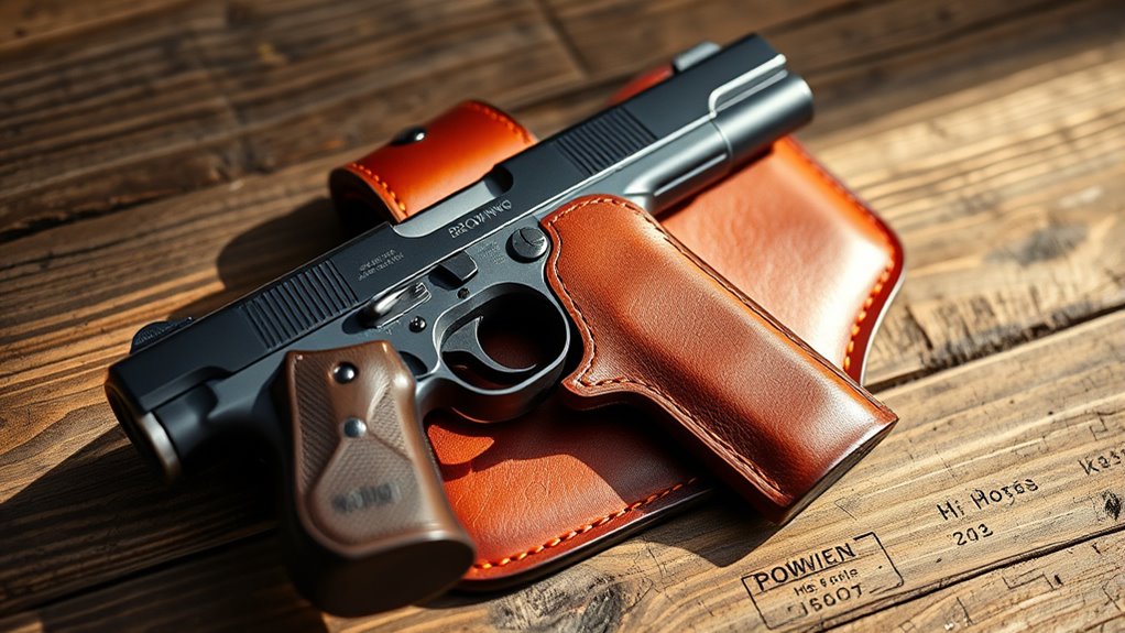 Since a proper fit guarantees both safety and ease of use, you should choose a holster designed specifically for the Browning Hi Power. Look for one molded to its exact shape to guarantee a secure, snug fit without excess movement. Check that the holster accommodates your belt width—usually up to 1.75 inches—to maintain proper attachment and stability.