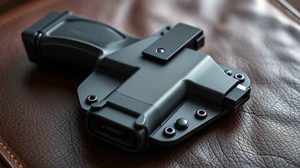 When selecting a holster for your Desert Eagle, prioritizing retention security features is essential to prevent accidental discharges and unauthorized access. Look for reliable retention mechanisms like thumb breaks, retention straps, or adjustable tension screws that keep the firearm securely in place during movement or activity. Adjustable systems let you customize the level of security, balancing quick access with safety.
