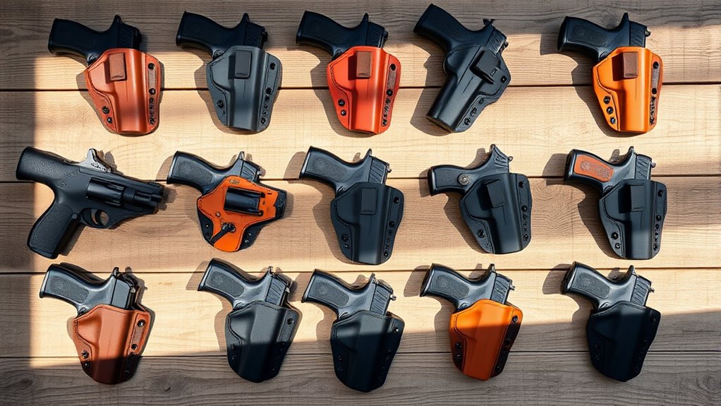 If you want something lightweight and moisture-resistant, synthetic materials like neoprene or nylon are affordable options that handle sweat and rain well. Kydex holsters provide a rigid, secure fit with excellent retention, though they might need some breaking in before feeling comfortable.