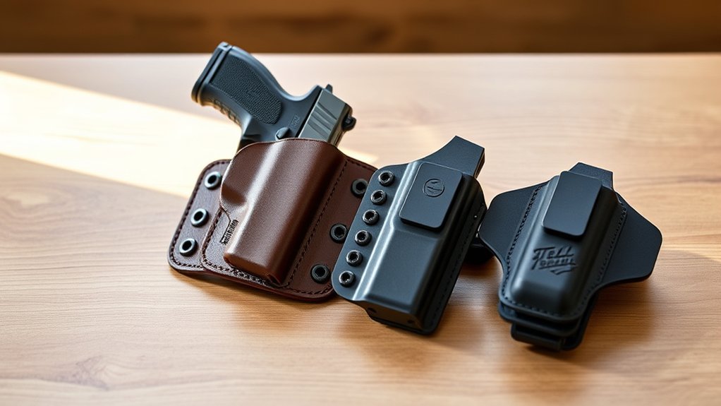 Weather-resistant materials are essential if you face varying climates, ensuring your holster stays functional without deforming. Choosing a holster made from properly constructed materials guarantees it securely holds your firearm and maintains its shape and strength over time, giving you reliable performance every day.