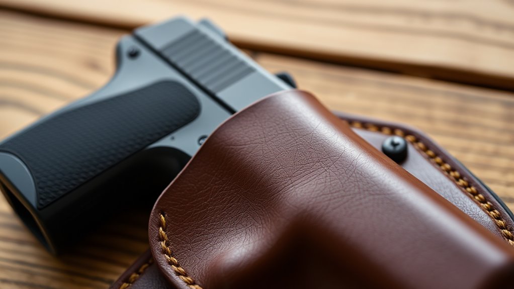 Whether you prefer inside- or outside-the-waistband carry, look for reinforced stitching, trigger coverage, and quick re-holstering features. These holsters balance concealment and accessibility perfectly. Keep exploring to discover which models suit your carry style and daily needs best.