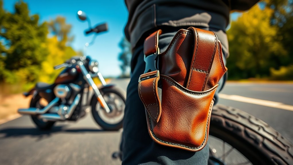 Choosing the right holster for motorcycle riding means prioritizing concealment and design to keep your gear discreet and accessible. You want a compact, non-bulky holster that fits easily under your jacket or riding gear without printing. Adjustable straps are key—they keep the holster secure, preventing any bouncing or shifting during your ride.