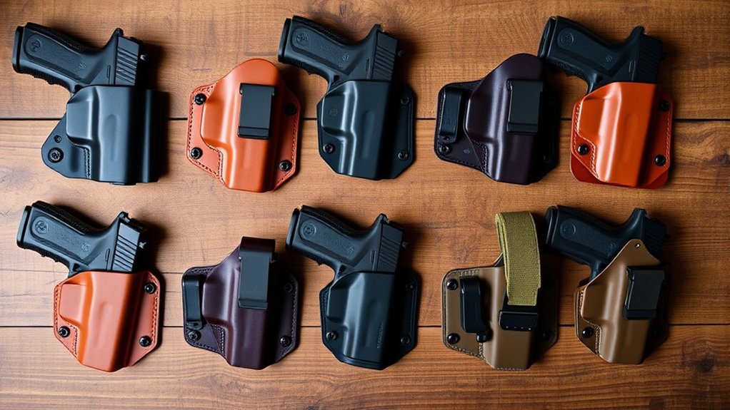 Ambidextrous designs and adjustable settings guarantee a personalized carry experience. Keep exploring to discover how these choices balance concealment, access, and reliability for your daily carry needs.
