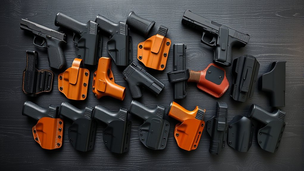 Whether you need concealed carry or quick access for outdoors, the best holsters balance protection, accessibility, and a custom fit. Keep exploring to find the perfect match for your needs.