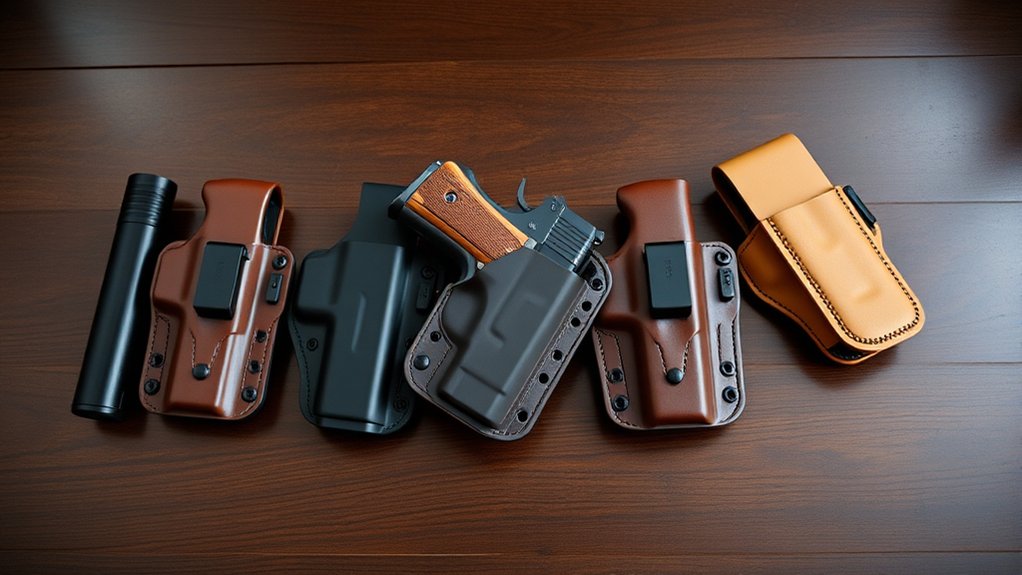 Durable materials like top-grain leather and polymer guarantee long-lasting performance. Keep in mind retention and carry positions to match your needs, and you’ll find the perfect match.