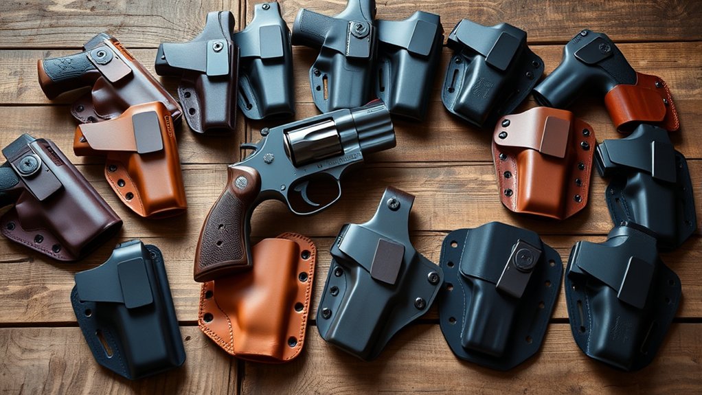 Hybrid holsters combine leather’s comfort with Kydex’s toughness, giving you a balanced, adjustable fit. Understanding these material types helps you pick a holster that matches your lifestyle and guarantees your Ruger GP100 stays secure and accessible.