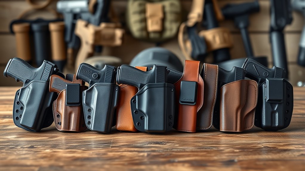 Ambidextrous designs let you adjust for either hand, accommodating your preference. Finally, choose holsters with adjustable clips or loops to switch mounting styles on belts or pants, ensuring convenience no matter your daily setup.
