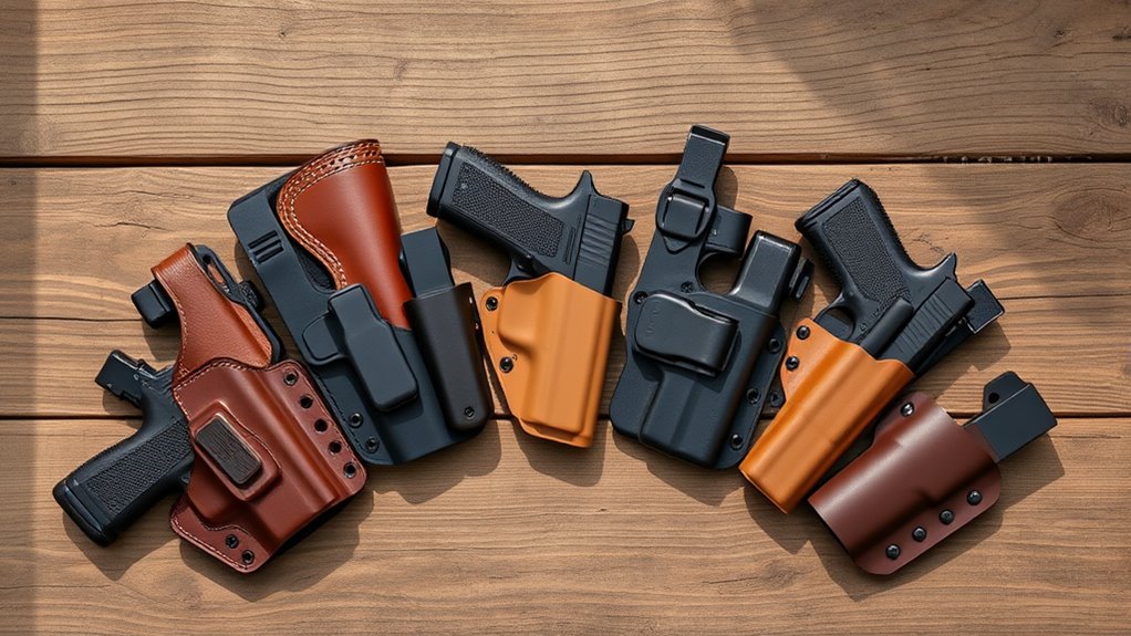 Nylon holsters are lightweight and reduce printing, enhancing comfort and concealment, but they don’t offer the same impact resistance as Kydex. Remember, the material also affects customization options—Kydex holsters generally support adjustable retention and attachments better. By weighing these factors, you can select a holster material that fits your daily needs while protecting your Staccato C effectively.