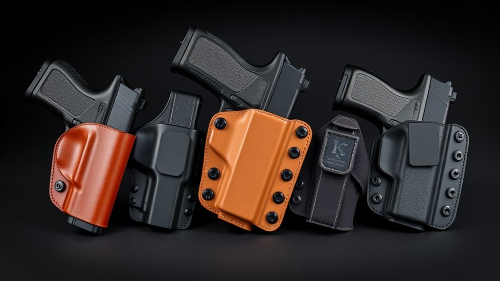For durability, you’ll want holsters made from Kydex, leather, or reinforced nylon. Kydex is tough, resistant to moisture, and keeps your firearm securely in place. Leather offers excellent longevity and molds to your gun over time, giving a custom fit.